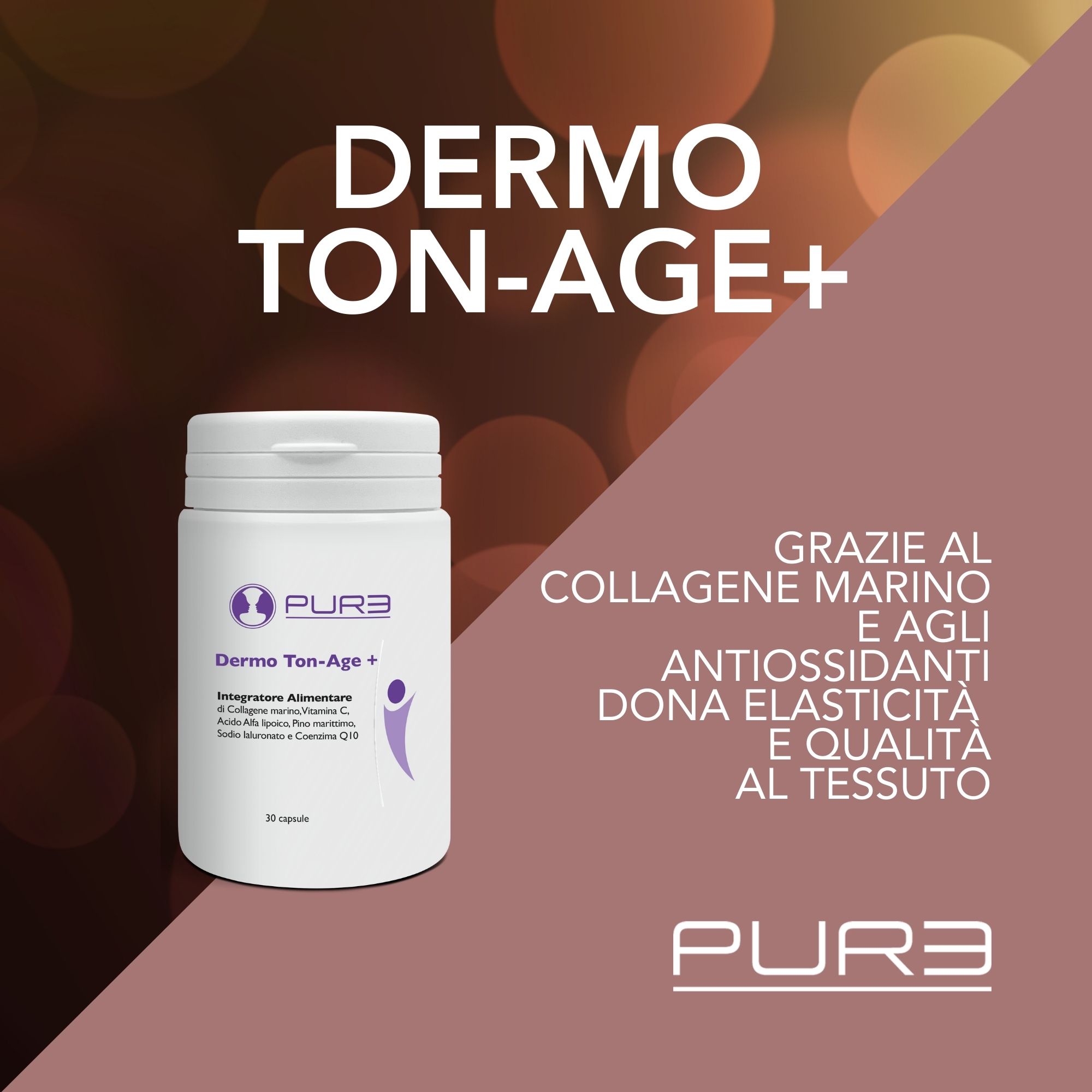Cos’è: integratore con miscela a forte azione antiossidante che apporta collagene marino, vitamina C, acido alfa-lipoico, pino marittimo, sodio ialuronato e coenzima Q10, con focus su epidermide e tessuti connettivi.